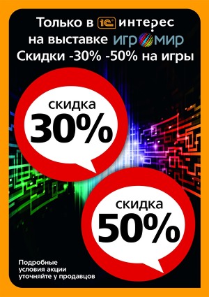 Приходите на выставку ИгроМир 2013 с 3 по 6 октября 2013 года и посетите магазин «1С Интерес», расположенный в павильоне №1 (зал 4, стенд А2), где вы сможете приобрести игры для PC, Sony PlayStation 3 и Xbox 360, из списка участвующих в акции, со скидками 30% и 50%!