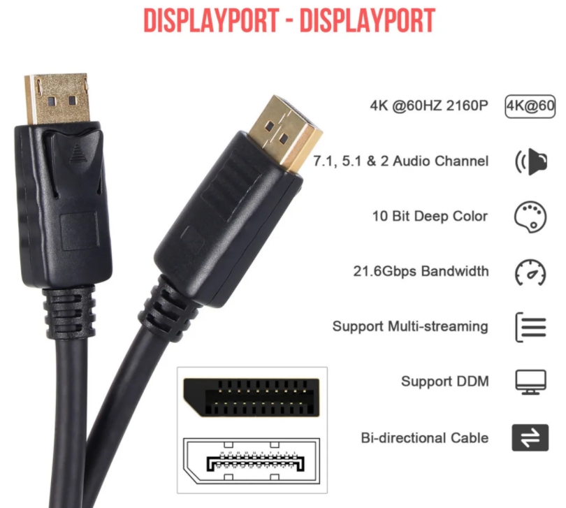 Особенности соединительного кабеля VCOM DisplayPort – DisplayPort 1.2 Telecom 4K 60Hz 2 м (CG712-2M):