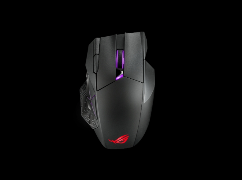 Игровая мышь с двумя интерфейсами, проводным USB и беспроводным 2,4 ГГц: магнитная зарядная станция, 12 программируемых кнопок, сенсор ROG с чувствительностью 19000 точек/дюйм, микропереключатели ROG с возможностью замены, кабель ROG Paracord и синхронизируемая подсветка Aura.