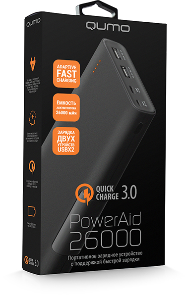 Qumo PowerAid QC 3.0 26000 одна из самых современных моделей нашей компании, которая, несомненно, будет радовать владельцев современных цифровых устройств.