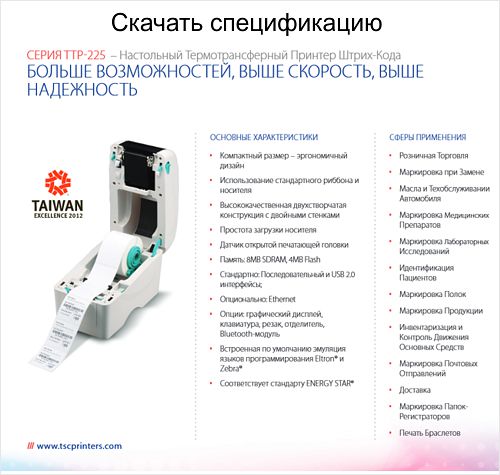 Принтер этикеток TTP-225 представляет первую серию 2-дюймовых термотрансферных настольных принтеров. Серия ТТР-225 – это современные технологии, высокая производительность и надежность в компактных размерах.