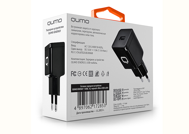 Описание сетевого зарядного устройства Qumo Energy 1USB 1A + кабель micro USB: