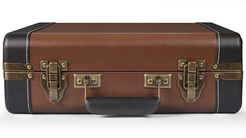 Визуальная часть проигрывателя – это классический вариант чемодана с отделкой под кожу. Основной цвет корпуса – коричневый (модель BROWN). Дополнительно есть окантовка черного цвета по краям с белой строчкой. Элементы крепления ручки и замка имеют характерный медный окрас, что приятно дополняет общий дизайн.