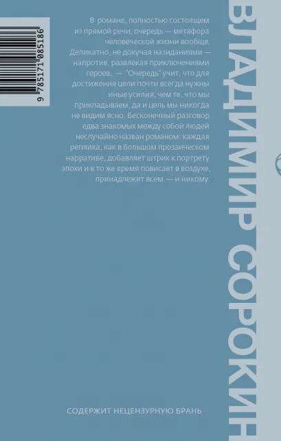 В очереди есть место и любви, и пьяной драке, и глубоким раздумьям, и смешным ситуациям. И все это – в великолепной стилистике настоящего народного языка. При этом роман – не просто срез эпохи, Сорокину удалось поймать саму суть человека, не важно, называет он себя советским или российским, запечатлеть ту самую загадочную русскую душу. Поэтому, читая это произведение в наши дни, невольно ловишь себя на мысли, что ничего не изменилось. А уж хорошо это или плохо – решать читателю.