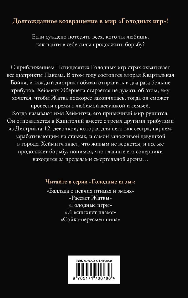 Оставить отзывС приближением Пятидесятых Голодных игр страх охватывает все дистрикты Панема. В этом году состоится вторая Квартальная Бойня, и каждый дистрикт обязан отправить в два раза больше трибутов. Хеймитч Эбернети старается не думать об этом, ему хочется, чтобы Жатва поскорее закончилась, тогда он сможет провести время с любимой девушкой и семьей.