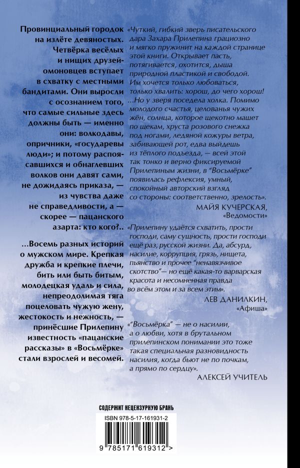 …Восемь разных историй о мужском мире. Крепкая дружба и крепкие плечи, бить или быть битым, молодецкая удаль и сила, непреодолимая тяга поцеловать чужую жену, жестокость и нежность, – принёсшие Прилепину известность «пацанские рассказы» в «Восьмёрке» стали взрослей и весомей.