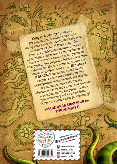 Эта книга создана для того, чтобы помочь ребёнку побороть свои страхи, в том числе страх перед чтением. Квест, весёлые истории и описание забавных монстриков – всё это под одной обложкой! Обязательно к прочтению для поклонников «Маленькой злой книги»! Внутри много весёлых иллюстраций. У издания эффектное оформление: кажется, кто-то откусил уголок книги… Интересно, кто?
