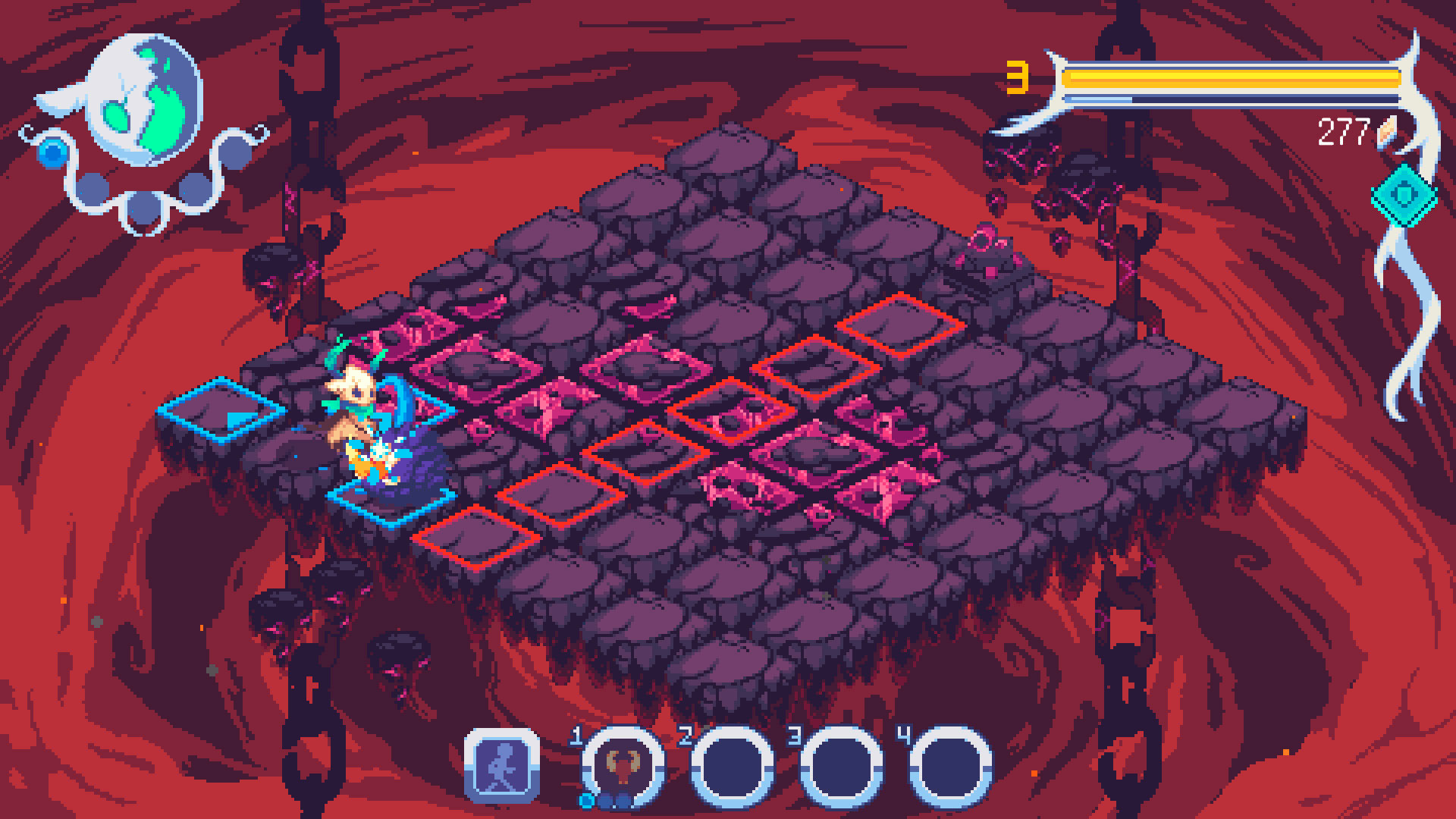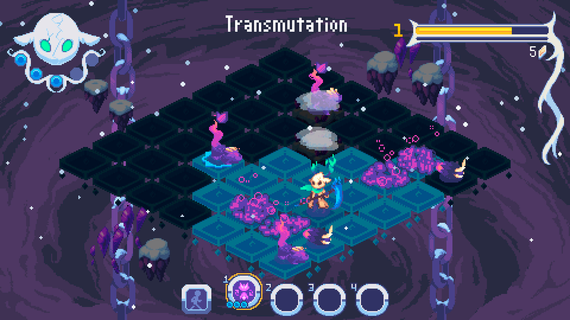 - Обхитрите врагов с помощью рывка и навыков – Продуманные атаки и перемещения ключ к успеху в игре. Нужно сократить дистанцию? Используйте рывок! Так вы переместитесь сразу на две клетки вперед, невзирая на препятствия. Так можно преодолеть преграду или занять позицию получше. И не забывайте про навыки и усилители. Эти активные и пассивные умения сформируют ваш стиль игры. Уровень навыков можно повышать и использовать их улучшенные версии в новых прохождениях. А чтобы увеличить эффективность усилителей, приглядывайте за шкалой Фокуса.