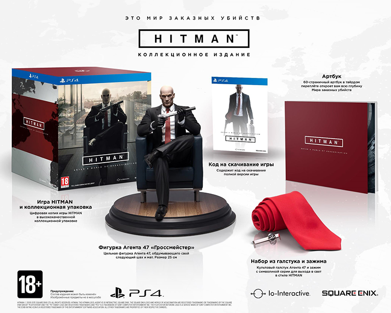 Уникальное коллекционное издание Hitman. Collector's Edition включает: код на скачивание полной версии игры, фигурку Агента 47 «Гроссмейстер», 60-ти страничный артбук в твердом переплете, набор из галстука и зажима и высококачественную коллекционную упаковку.