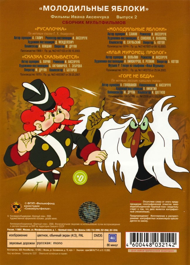 Оставить отзывВ сборник вошли пять мультипликационных фильма режиссера Ивана Аксенчука: «Русалочка», «Сказка сказывается», «Молодильные яблоки», «Илья Муромец (Пролог)», «Горе не беда»