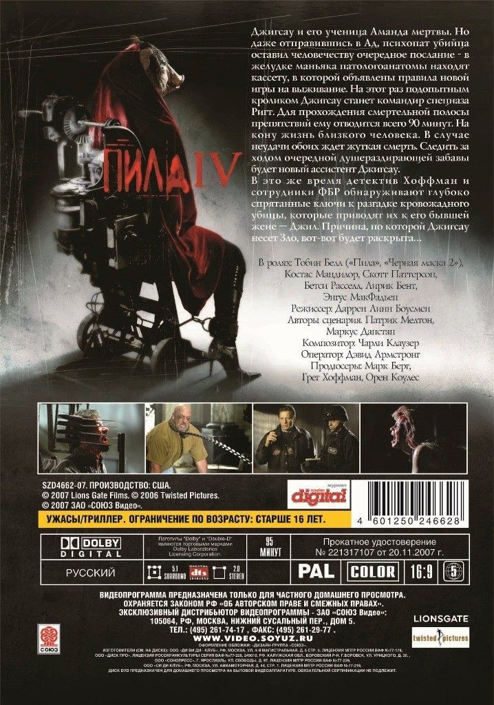 «Пила IV» расширяет картину и показывает, что даже после завершения одной истории игра может продолжаться. Расследование, найденные улики и новые ловушки складываются в запутанный пазл, где события идут параллельно и раскрывают скрытые связи – и истинные цели тех, кто стоит за испытаниями.