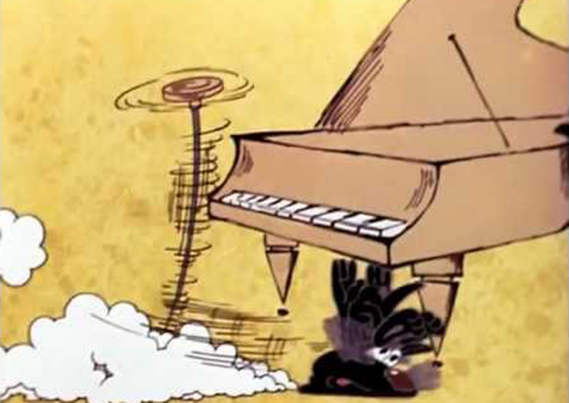 Клякса – так зовут маленькую черную собачку, которая собирается сыграть на рояле. Правда, у нее не очень получается: сначала от нее убегает крутящаяся табуретка, затем – одна из ножек рояля. И когда наконец Клякса ударяет по клавишам, хлопает крышка рояля, и весь рояль проваливается сквозь пол! А Клякса смотрит вслед…