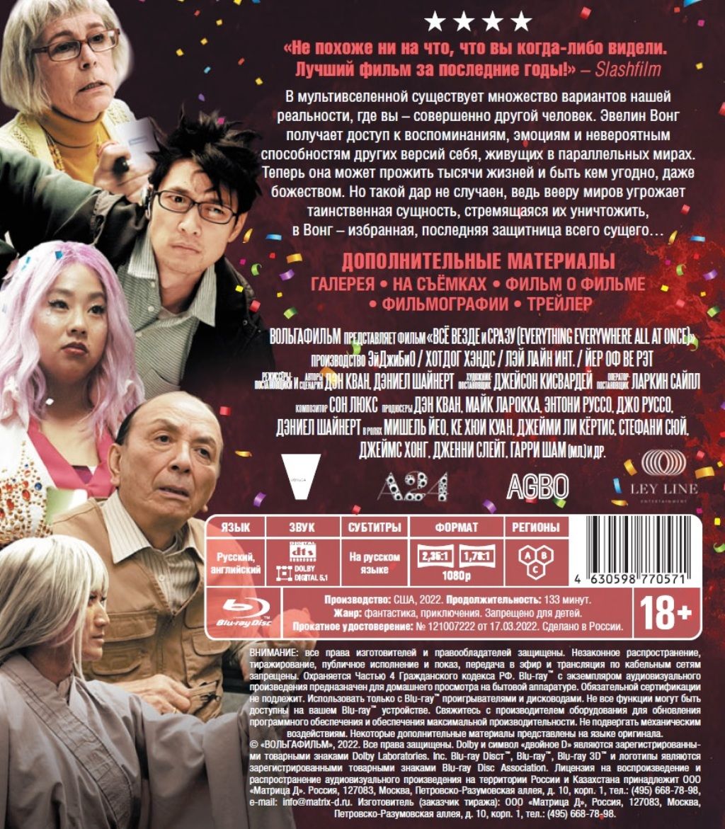 Оставить отзывВ жизни Эвелин царит бардак. Она никак не может составить налоговый отчёт, пожилой отец постоянно требует внимания, муж витает в облаках, а ещё и дочка добавляет проблем своей личной жизнью. Во время визита в налоговую всё запутывается ещё сильнее – оказывается, Эвелин может скакать по параллельным вселенным и получать доступ к воспоминаниям и навыкам других версий самой себя. И теперь, в полнейшем хаосе, женщине придётся противостоять загадочной злой сущности, которая решила разрушить не только этот мир, но и всю мультивселенную.