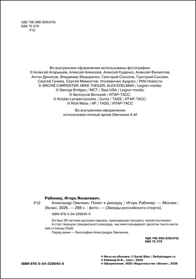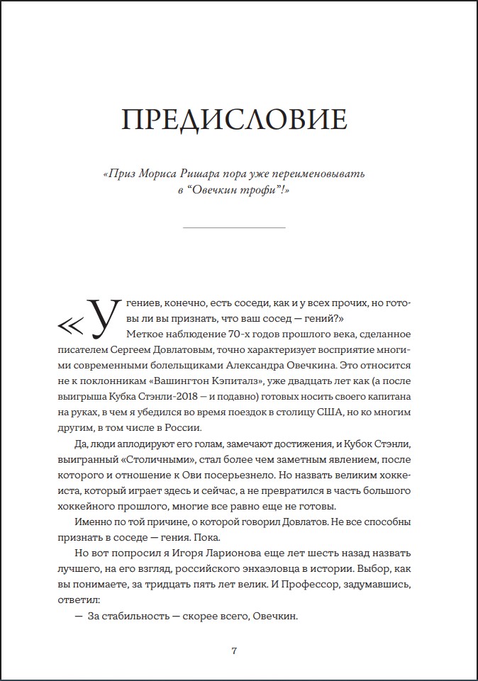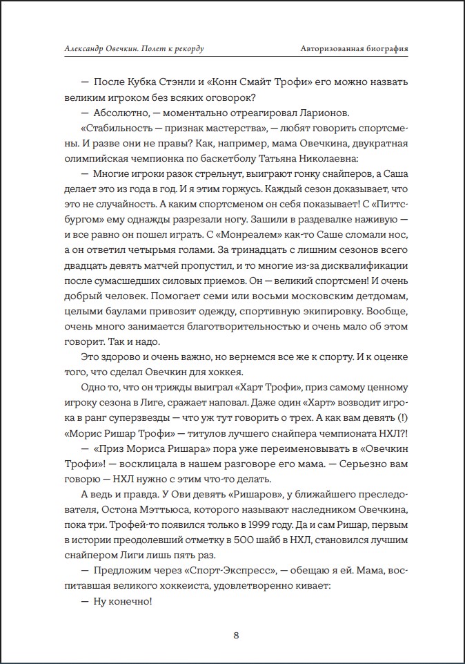 Перед вами – биография Александра Овечкина. Это откровенный и эмоциональный рассказ капитана «Вашингтон кэпиталз», его родных и товарищей о строгих уроках родителей, тренерах, которые верили в него, партнерах и соперниках, без которых не было бы великих побед. Автор, Игорь Рабинер, – журналист, который общается с героем уже больше 20 лет.