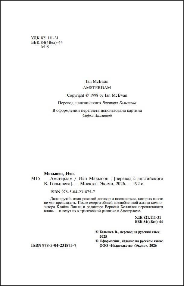 Двое друзей, один роковой договор и последствия, которые никто не мог предсказать. После смерти общей возлюбленной жизни композитора Клайва Линли и редактора Вернона Холлидея переплетаются вновь – и ведут их к трагической развязке в Амстердаме.
