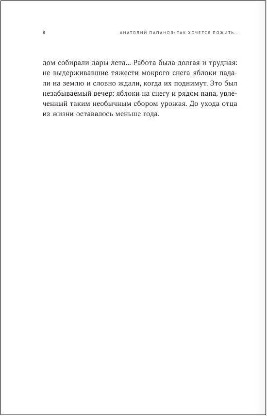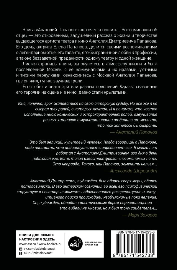 Книга «Анатолий Папанов: так хочется пожить... Воспоминания об отце» – это откровенный, задушевный рассказ о жизни и творчестве выдающегося актера театра и кино Анатолия Дмитриевича Папанова. Его дочь, актриса Елена Папанова, делится своими воспоминаниями о легендарном отце, его таланте и скромности, его безграничной любви к профессии, а также беззаветной преданности одному театру и одной-единственной женщине. Листая страницы книги, вы окунетесь в атмосферу жизни и быта послевоенной Москвы с ее коммуналками и их нравами, уютными и тихими переулками, ознакомитесь с Москвой Анатолия Папанова, где он жил, гулял, заучивал роли.