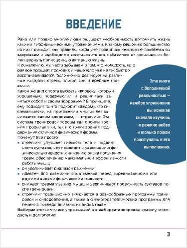 В книге представлены комплексы упражнений, подходящие для того, чтобы продуктивно для вашего тела начинать, а потом завершать рабочий день, снимать напряжение во время работы за компьютером, а также для тех, кто переступил 45-летний рубеж. Особое внимание уделено таким видам тренировок, как стретчинг в паре и миофасциальный релиз, последний является идеальным способом работы со спазмированными мышцами после интенсивных нагрузок. Все упражнения сопровождаются комментариями и советами профессиональных тренеров. А главное – кроме пошаговой инструкции, здесь есть видео, которое поможет не только повторить выбранное упражнение с первого раза, но и рассмотреть во всех подробностях, какие мышцы задействованы при его выполнении.