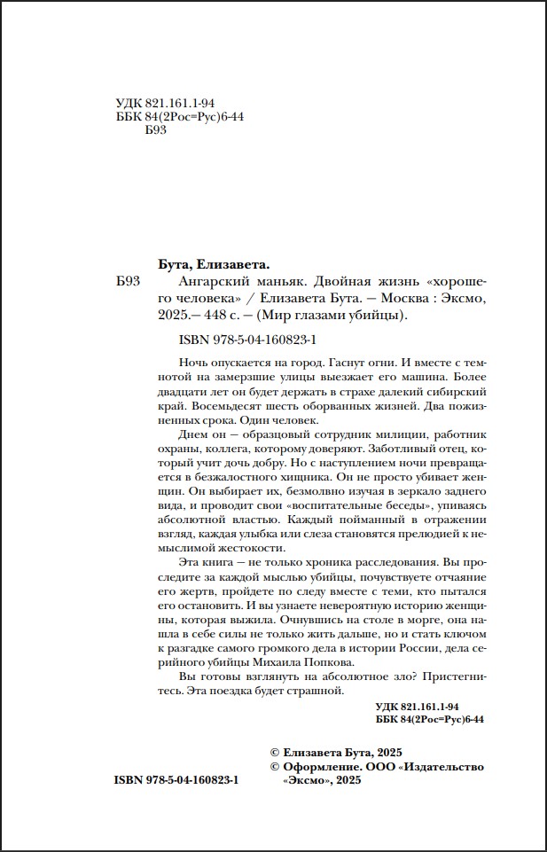 Очнувшись на столе в морге, она нашла в себе силы не только жить дальше, но и стать ключом к разгадке самого громкого дела в истории России, дела серийного убийцы Михаила Попкова. Вы готовы взглянуть на абсолютное зло? Пристегнитесь. Эта поездка будет страшной.