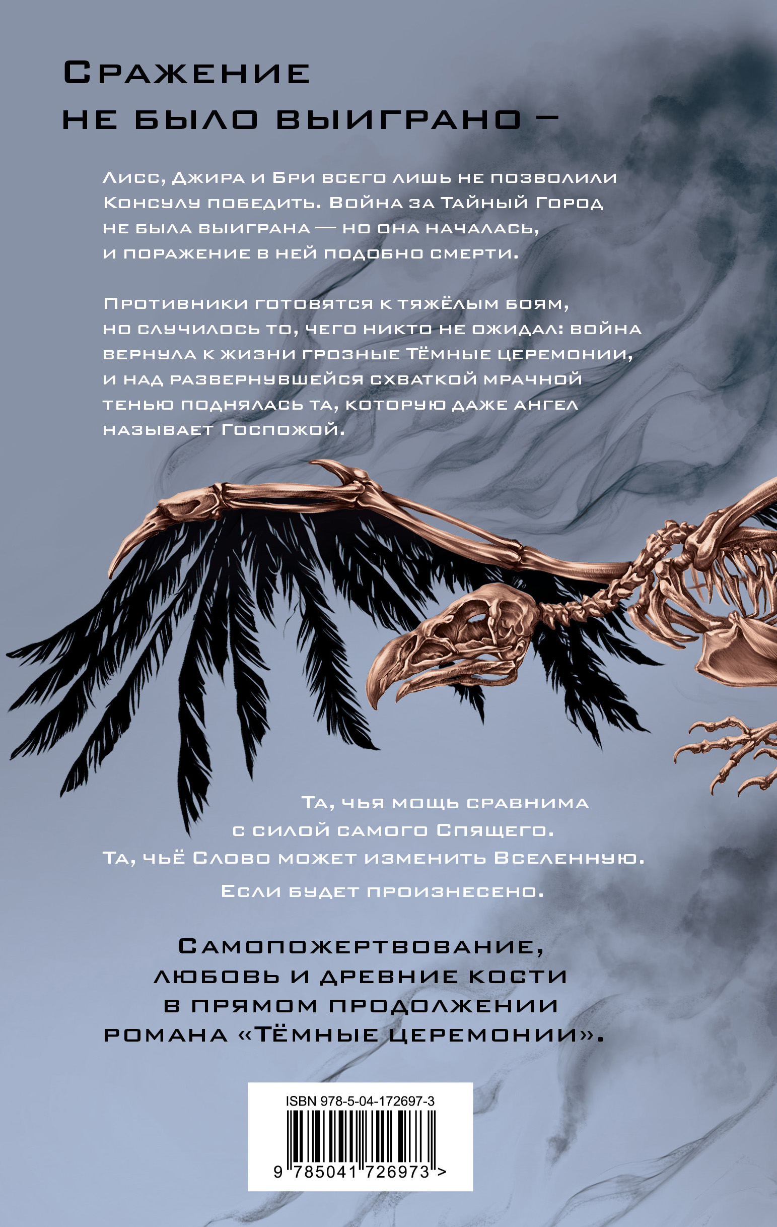 Сражение не было выиграно – Лисс, Джира и Бри всего лишь не позволили Консулу победить. Война за Тайный Город не была выиграна – но она началась, и поражение в ней подобно смерти. Противники готовятся к тяжёлым боям, но случилось то, чего никто не ожидал: война вернула к жизни грозные Тёмные церемонии, и над развернувшейся схваткой мрачной тенью поднялась та, которую даже ангел называет Госпожой. Та, чья мощь сравнима с силой самого Спящего. Та, чьё Слово может изменить Вселенную. Если будет произнесено. Самопожертвование, любовь и древние кости в прямом продолжении романа «Тёмные церемонии».