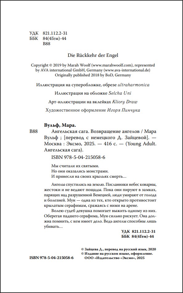 Мара Вульф – популярнейшая немецкая молодежная писательница, чьи книги переведены на многие языки! В «Ангельской саге» вас ждут: ангелы, потонувшие в грехах; девушка, намеренная защитить свою семью; ключи, способные открыть ворота рая; Небесный двор; Венеция. И не только.