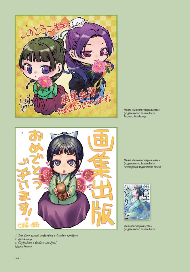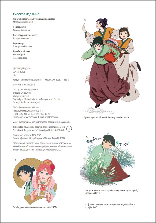 Артбук «Монолог фармацевта» – ваш проводник в мир любимой истории. Здесь собраны работы иллюстратора ранобэ Токо Сино, концепты персонажей с её комментариями, неопубликованные дизайны и эксклюзивные материалы, а также рассказ художницы о своём творческом пути. Более трёхсот артов позволят вам детально изучить главных героев и их окружение.