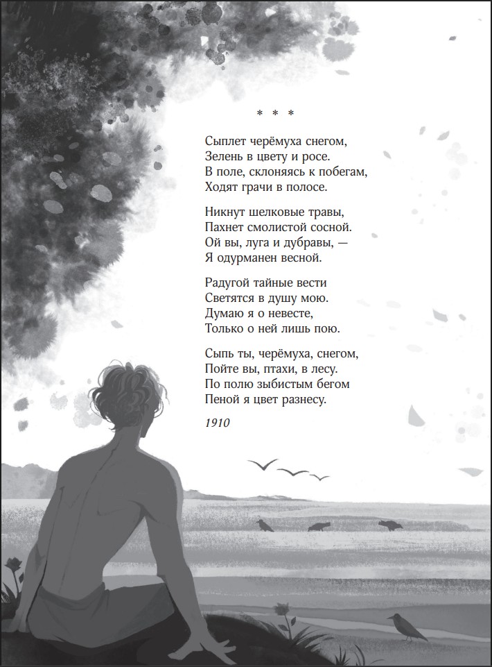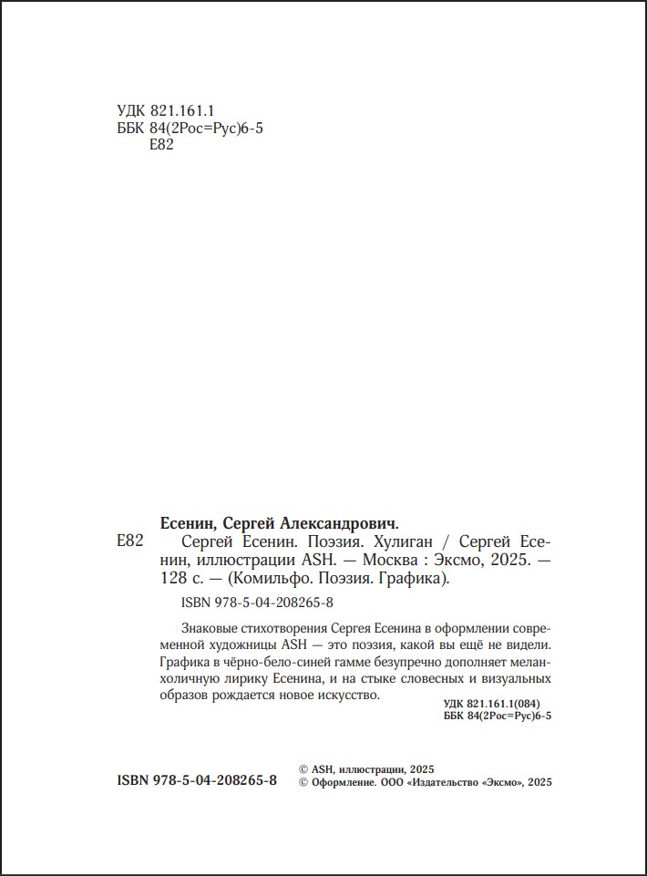 Знаковые стихотворения Сергея Есенина в оформлении современной художницы ASH – это поэзия, какой вы еще не видели. Графика в черно-бело-синей гамме безупречно дополняет меланхоличную лирику Есенина, и на стыке словесных и визуальных образов рождается новое искусство.