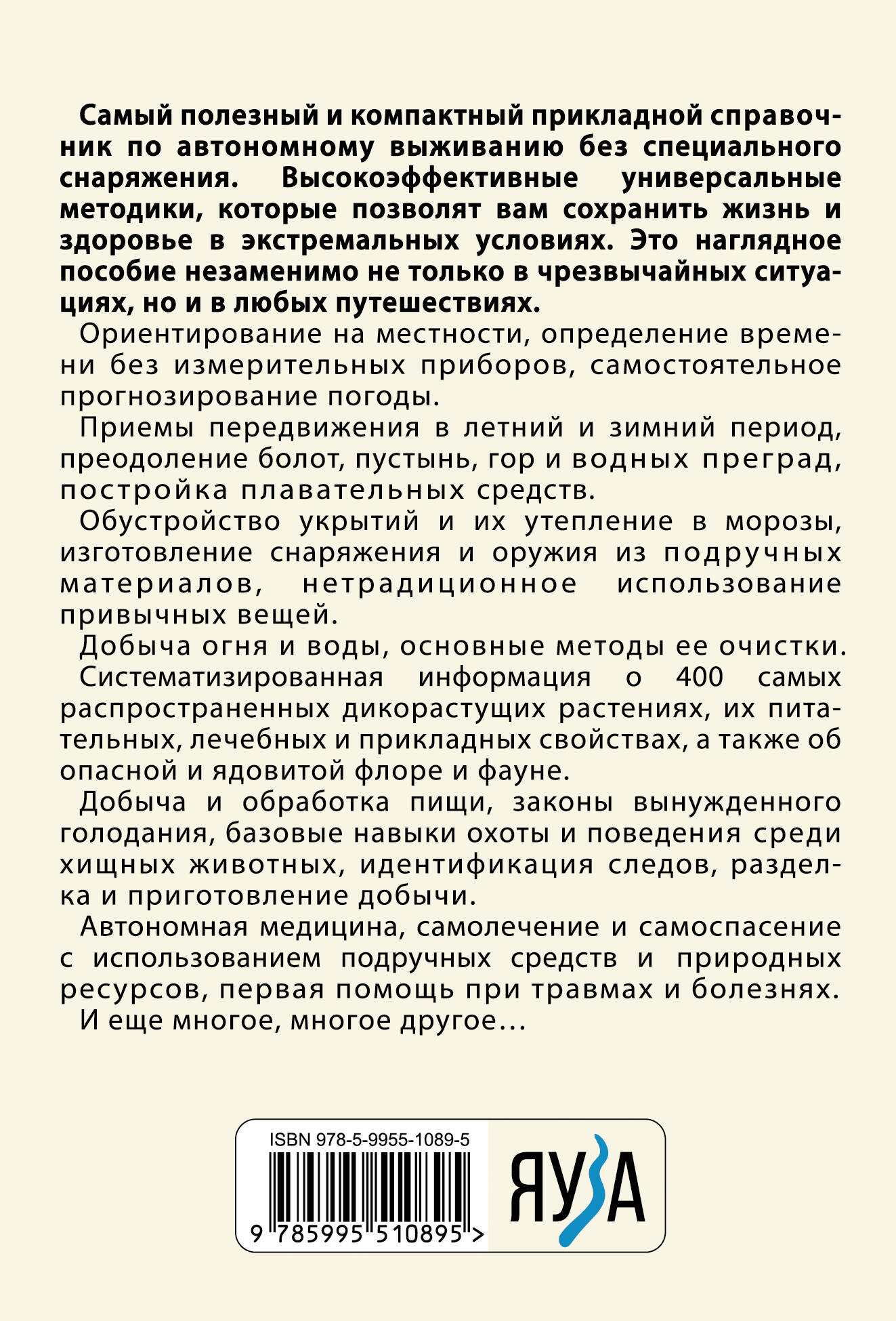 Самый полезный и компактный прикладной справочник по автономному выживанию без специального снаряжения. Всё о правильном поведении в опасных ситуациях. Каждый абзац этого наглядного пособия является рекомендацией к действию, а главы идут в приоритетном для выживания порядке.