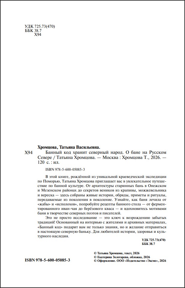 В этой книге, рождённой из уникальной краеведческой экспедиции по Поморью, Татьяна Хромцова приглашает вас в увлекательное путешествие по банной культуре.
