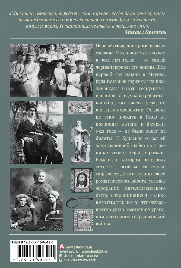 Оставить отзывПервые наброски к роману были сделаны Михаилом Булгаковым, тогда начинающим писателем, в 1922-1923 годах – «в самый черный период» его жизни. Шел первый год жизни в Москве, куда Булгаков переехал из Владикавказа: голод, беспросветная нищета, сдельная работа за копейки, ни своего угла, ни внятных перспектив. Он даже не смог поехать в Киев на похороны матери в феврале 1922 года – не было денег на билеты. И Булгаков отдал ей дань сыновней любви на страницах своего первого романа. Романа, в котором по-своему «отпел» – воспевая – сказочный мир своего детства, улицы своей романтической юности, уютные декорации интеллигентского быта, сохранившиеся только в его памяти. Все то, что безвозвратно ушло, сметенное ураганом революции и Гражданской войны.