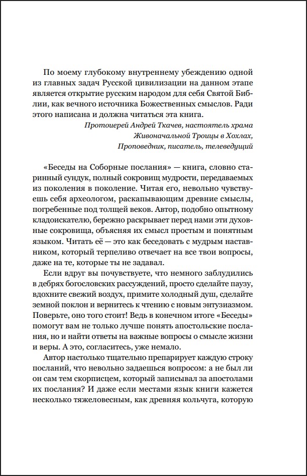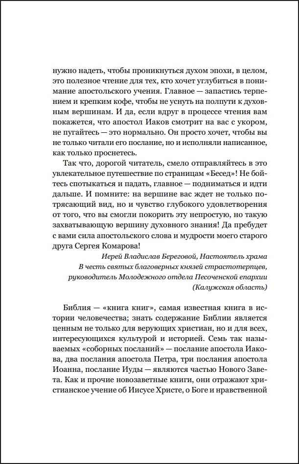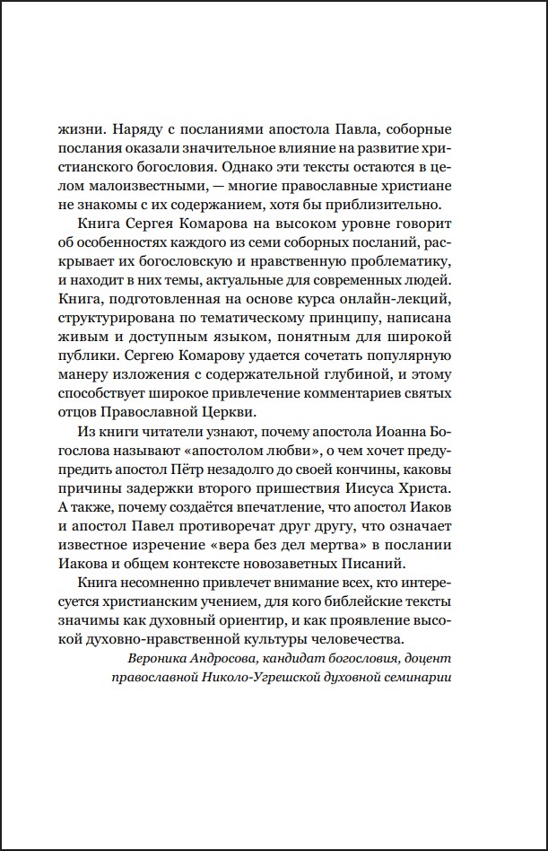 Книга Сергея Комарова на высоком уровне говорит об особенностях каждого из семи соборных посланий, раскрывает их богословскую и нравственную проблематику и находит в них темы, актуальные для современных людей.