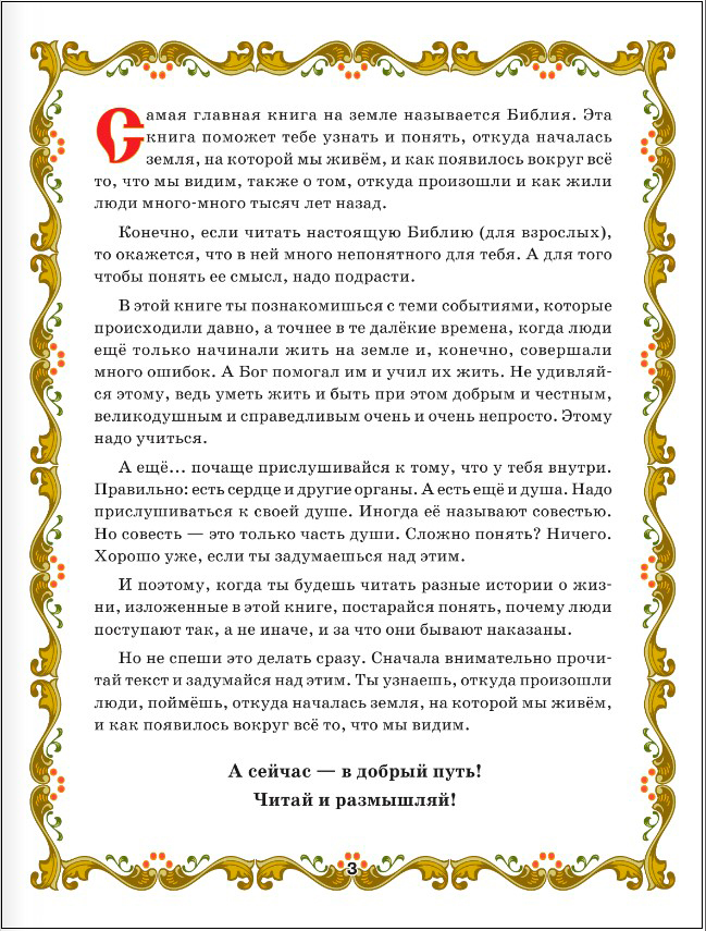 В данном издании самая популярная книга на Земле – «Библия» – адаптирована для детей. В ней освещены основные факты древней истории, доступно и в художественной форме пересказана легенда о сотворении мира, появлении Адама и Евы, изложена жизнь Иисуса Христа и Богородицы. Замечательные рисунки дают возможность ребенку увидеть явление ангелов, крещение Иисуса Христа, укрощение бури, хождение Христа по водам и др. Но самое главное достоинство этой книги состоит в том, что простые вопросы, данные в конце каждого рассказа, заставляют ребенка задуматься над тем, что он прочел, и порассуждать, как бы он поступил в данной ситуации. Таким образом, малыш является не просто читателем или слушателем, а как бы участником тех далеких событий. Книга предназначена для детей и их родителей.