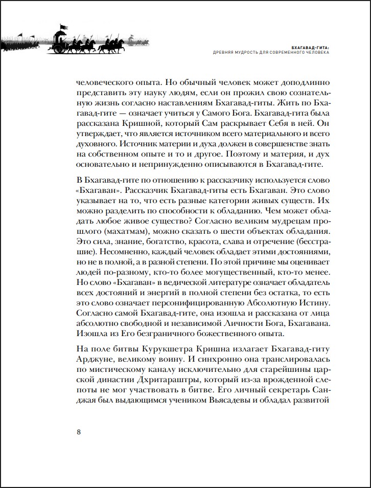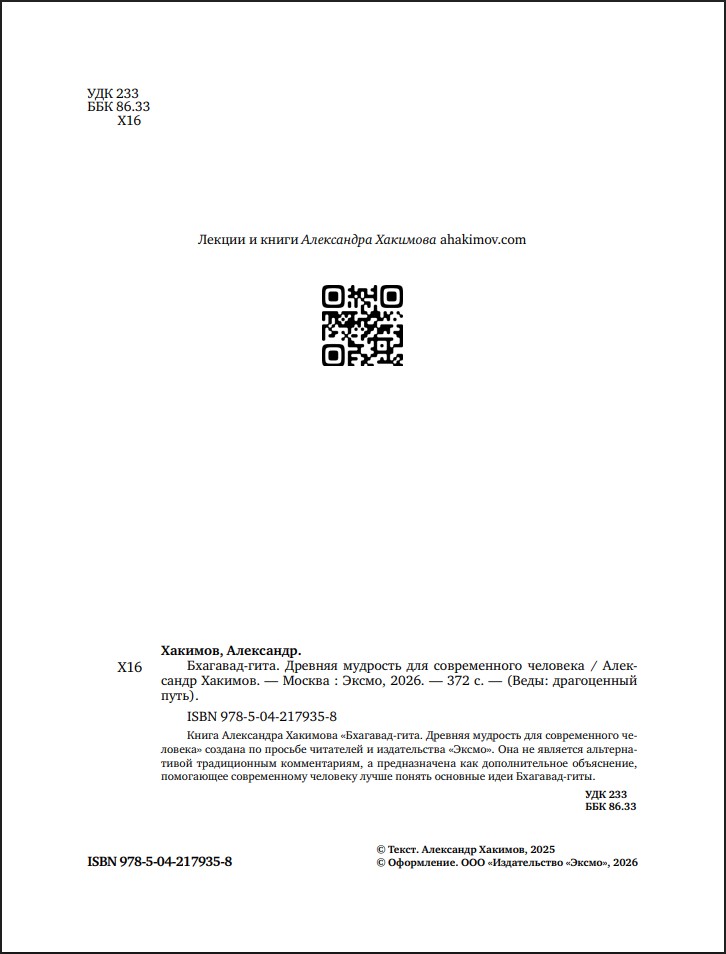Книга Александра Хакимова создана по просьбе читателей и издательства ЭКСМО. Она не является альтернативой традиционным комментариям, а предназначена как вспомогательное объяснение, помогающее современному человеку лучше понять основные идеи Бхагавад-гиты.