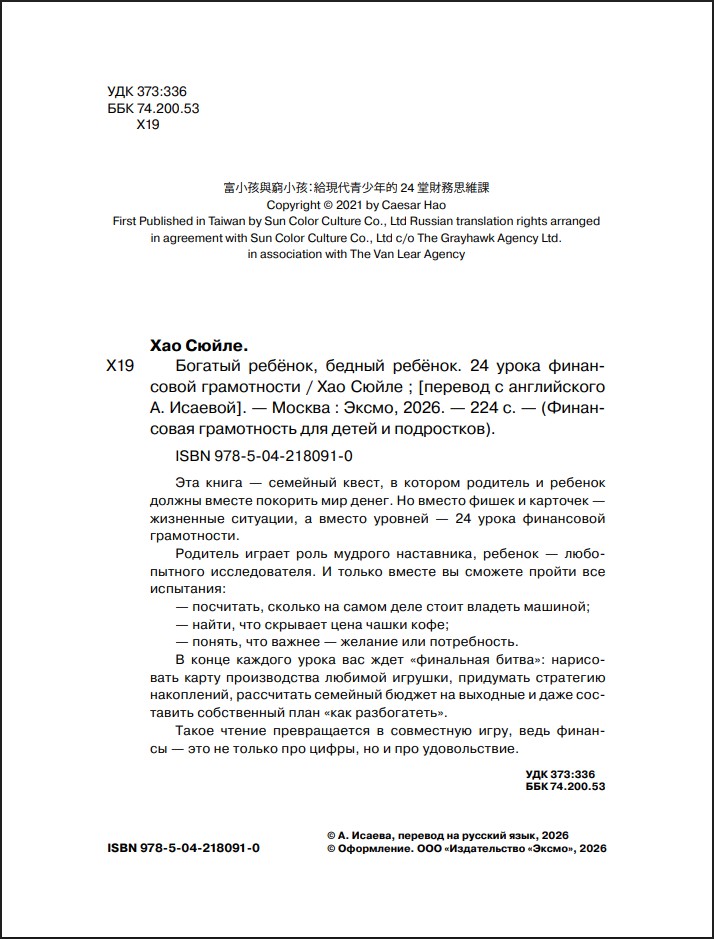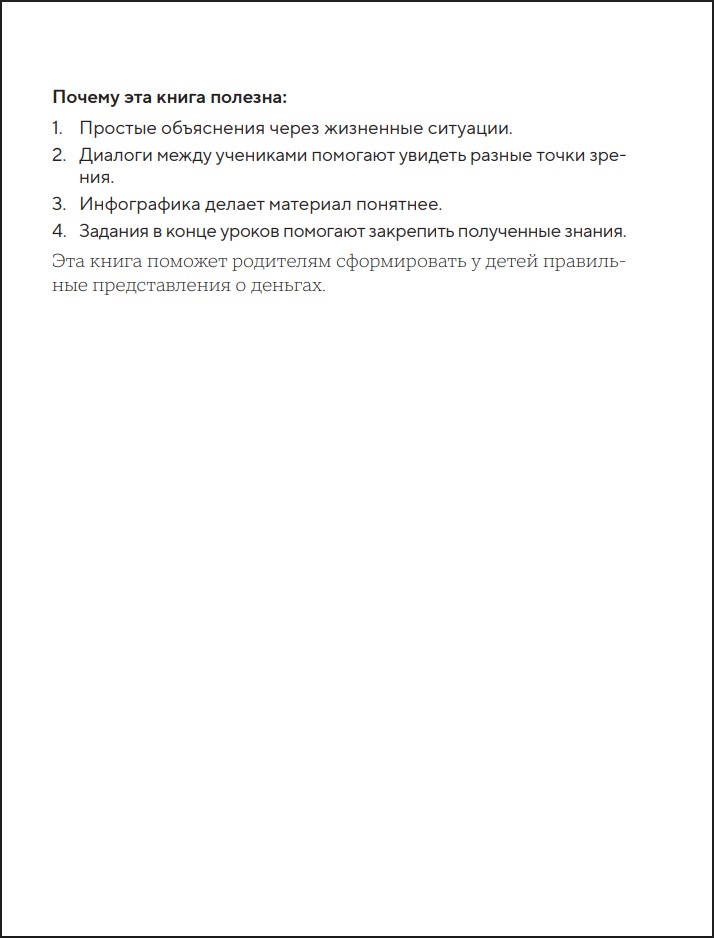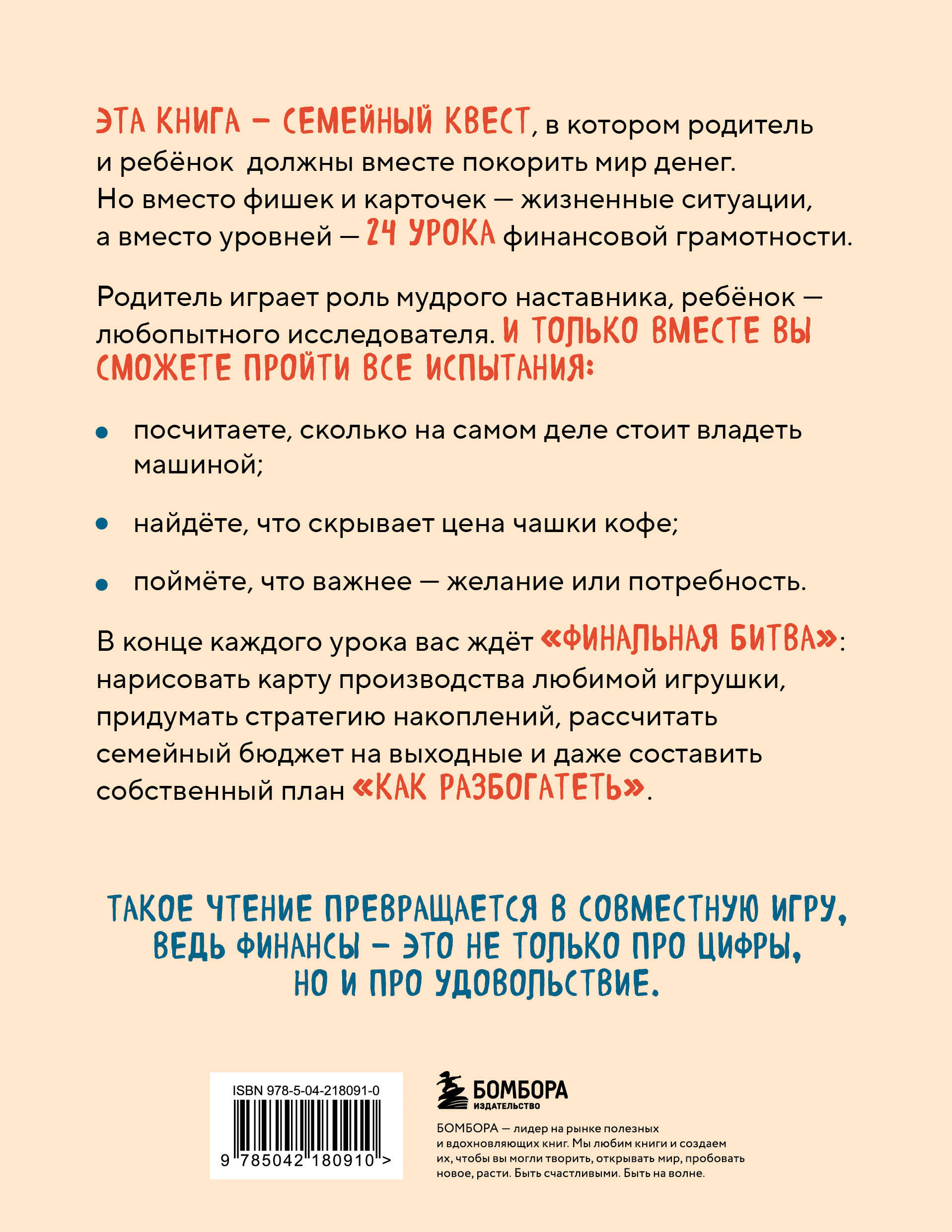 Эта книга – семейный квест, в котором родитель и ребенок должны вместе покорить мир денег. Но вместо фишек и карточек – жизненные ситуации, а вместо уровней – 24 урока финансовой грамотности. Родитель играет роль мудрого наставника, ребенок – любопытного исследователя.