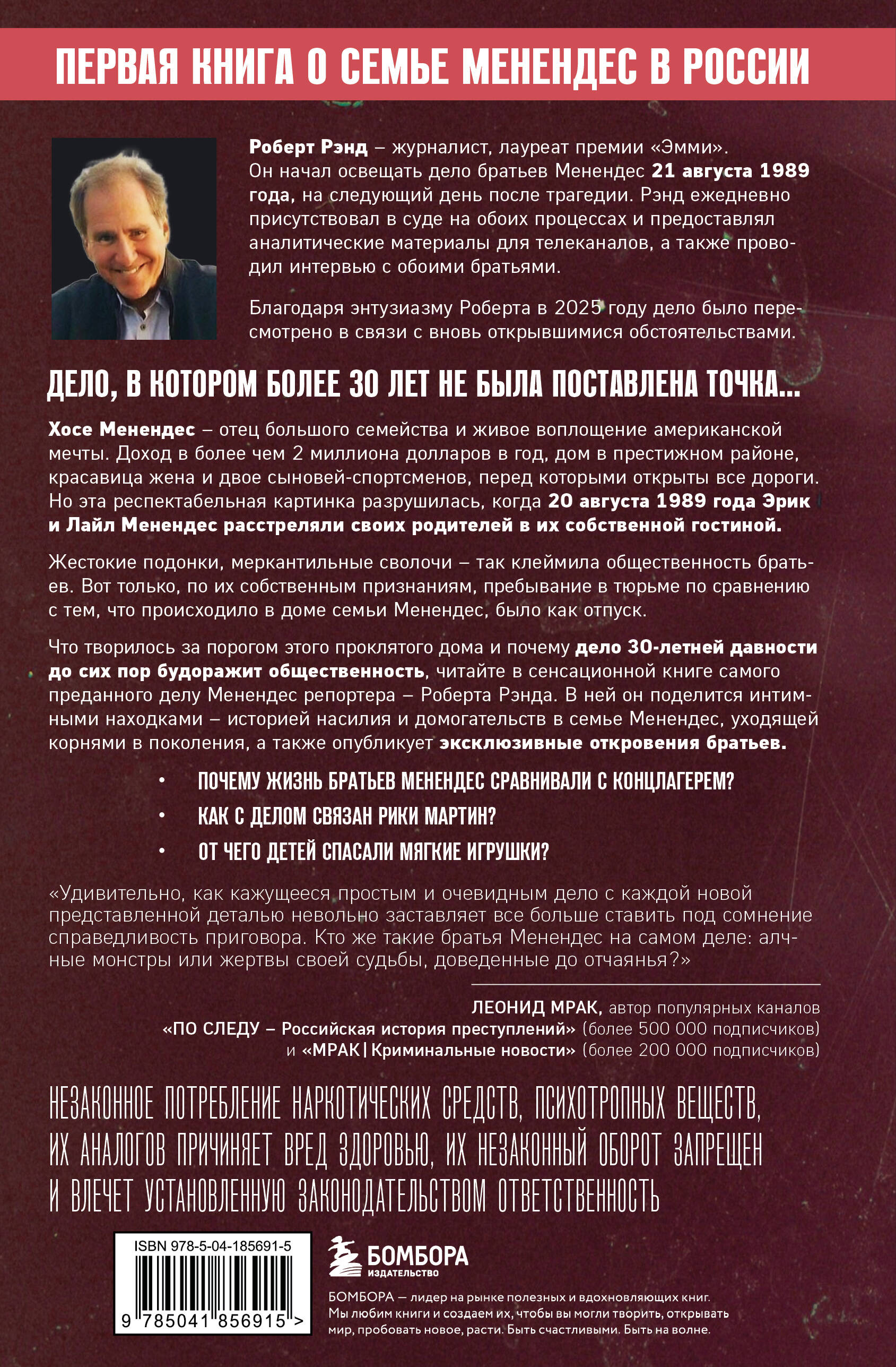 Эта книга – кульминация более чем 30-летней работы журналиста Роберта Рэнда, изучившего каждую деталь жестокой трагедии. Имея уникальную возможность доступа к семье Менендес, Рэнд раскрыл необычайные подробности, ошеломляющие, никогда ранее не публиковавшиеся откровения, которые привели к пересмотру дела братьев в суде.