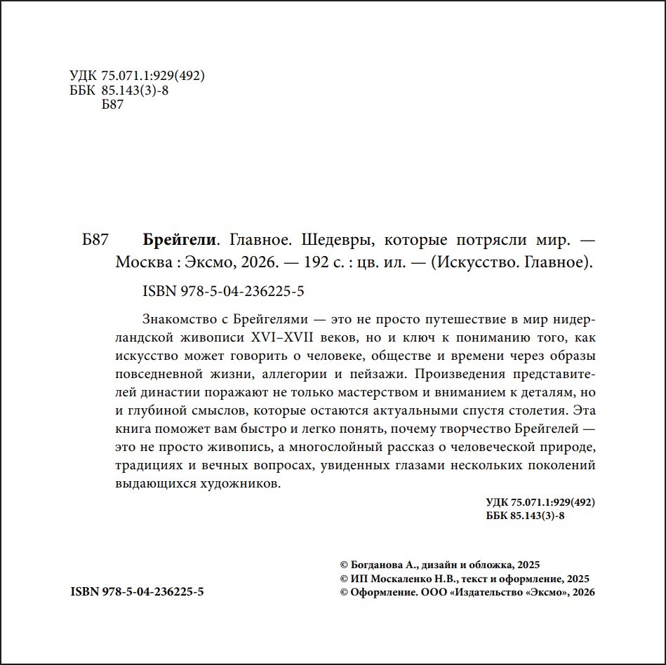 Погрузиться в мир Брейгелей можно за час, в любом удобном месте: дома, в дороге или в перерыве между делами. Благодаря качественным изображениям на мелованной бумаге вы поймёте, в чём уникальность живописи Питера Брейгеля Старшего, как его сыновья развили и переосмыслили наследие отца и почему сцены повседневной жизни, пейзажи и аллегории Брейгелей стали важной частью истории европейского искусства. Это идеальный формат для тех, кто хочет быстро и легко разбираться в искусстве.