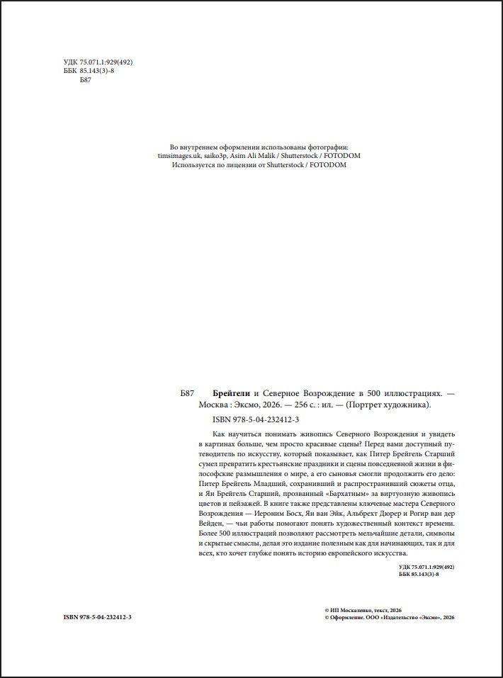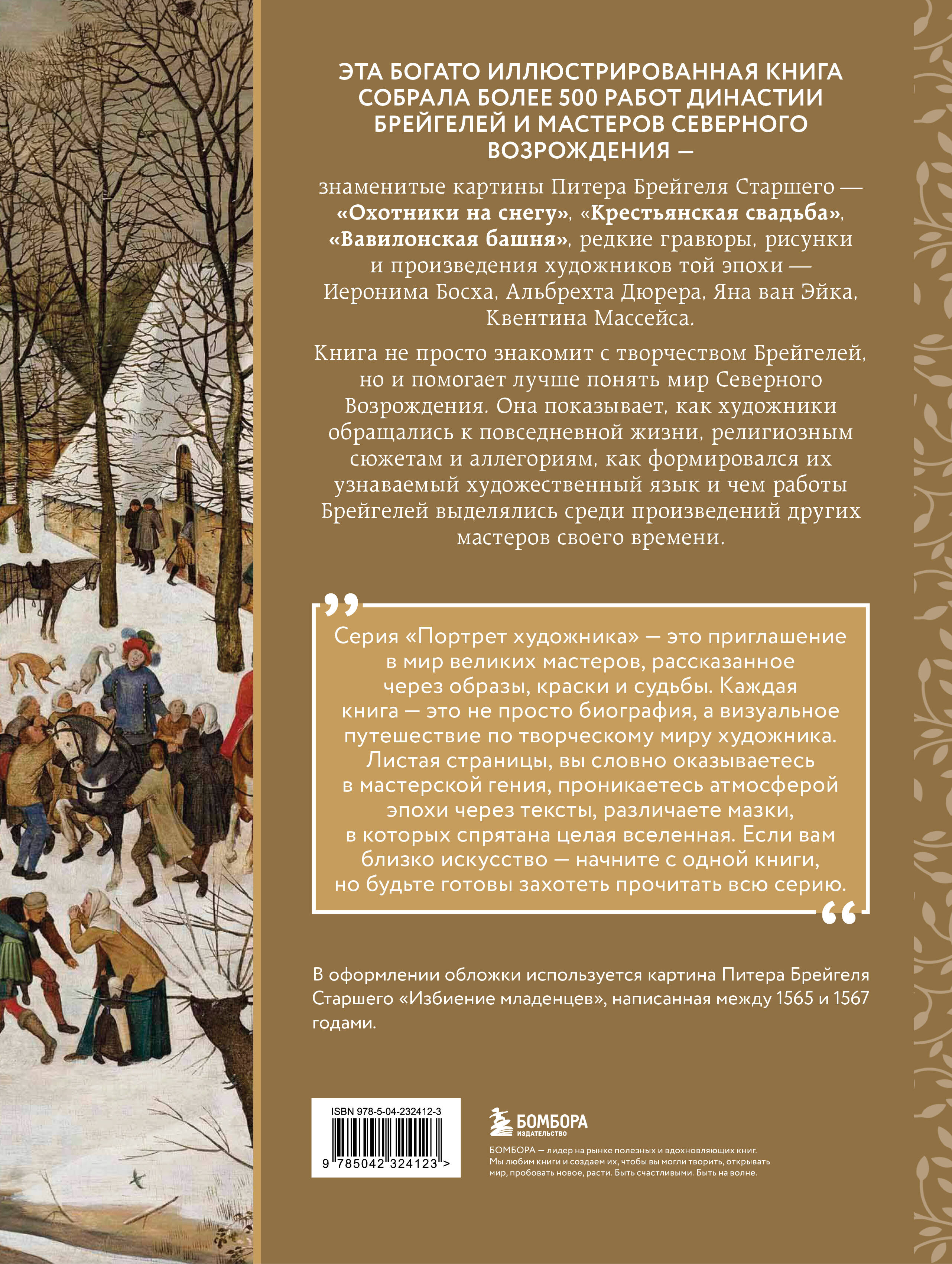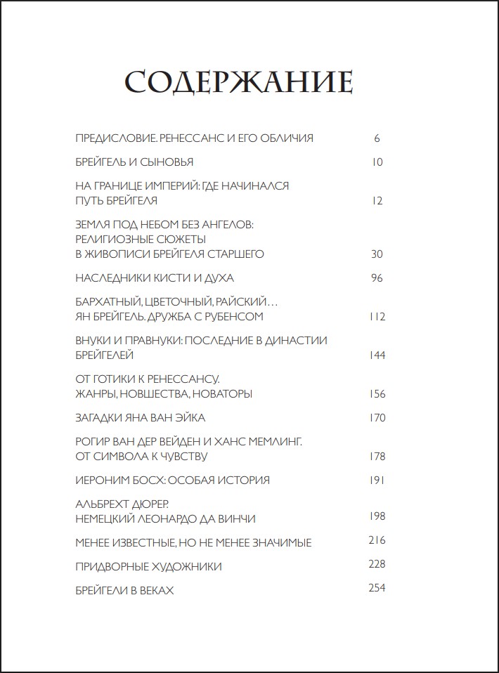 В издании также представлены другие выдающиеся мастера эпохи – Иероним Босх, Ян ван Эйк, Альбрехт Дюрер, Рогир ван дер Вейден и Ханс Мемлинг, чьи работы помогают увидеть художественный контекст времени. Особое внимание уделено главным шедеврам династии: «Вавилонской башне», «Охотникам на снегу», «Крестьянской свадьбе», «Триумфу смерти» и знаменитым натюрмортам Яна Брейгеля.