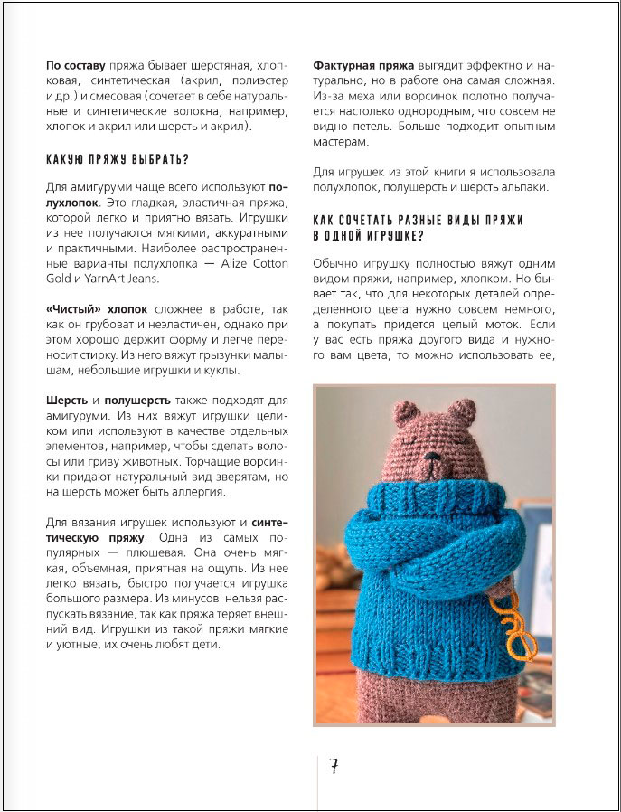 Все мастер-классы состоят из описаний по рядам и пошаговых фотографий. Также автор делится советами по выбору материалов и инструментов и основными приемами вязания.