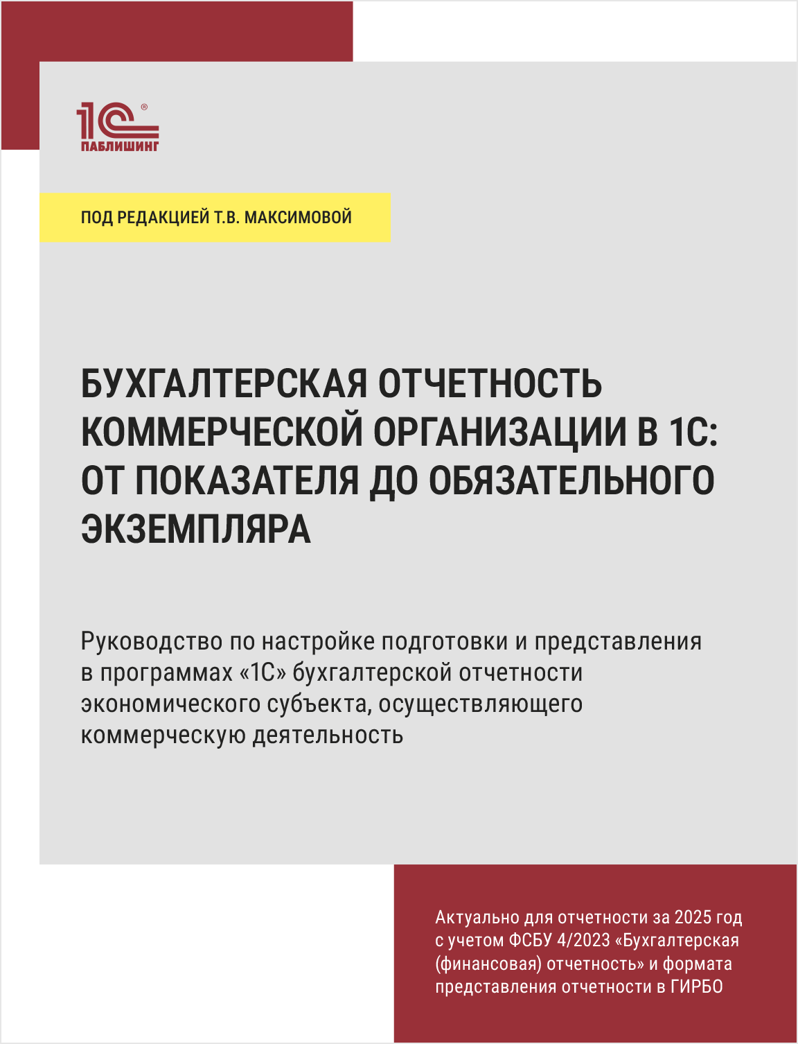 Руководство предназначено для информационной поддержки процесса подготовки и представления в программах 1С бухгалтерской отчетности экономического субъекта, осуществляющего коммерческую деятельность. Это издание выходит применительно к отчетности за 2025 год с учетом ФСБУ 4/2023 «Бухгалтерская (финансовая) отчетность» и приказа ФНС России от 15.11.2024 №ЕД-7-1/104, утвердившего формат представления отчетности в ГИРБО (государственный информационный ресурс бухгалтерской отчетности).
