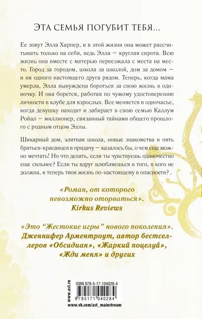 Роман рассказывает о сироте – ученице старших классов школы, у которой внезапно появляется опекун‑миллионер и пятеро названных братьев‑красавцев. Произведение открыло цикл «Семья Ройалов», куда вошли еще пять романов – «Сломленный принц», «Разрушенный дворец», «Запятнанная корона», «Отвергнутый наследник» и «Расколотое королевство».