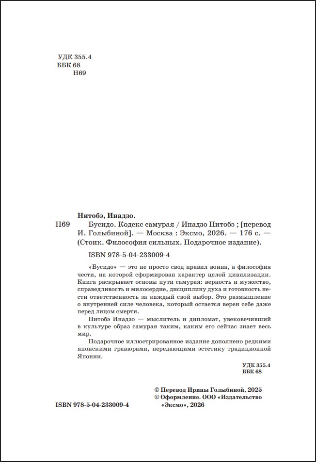 Оставить отзыв«Бусидо» – это не просто свод правил воина, а философия чести, на которой сформирован характер целой цивилизации. Книга раскрывает основы пути самурая: верность и мужество, справедливость и милосердие, дисциплину духа и готовность нести ответственность за каждый свой выбор.