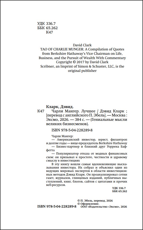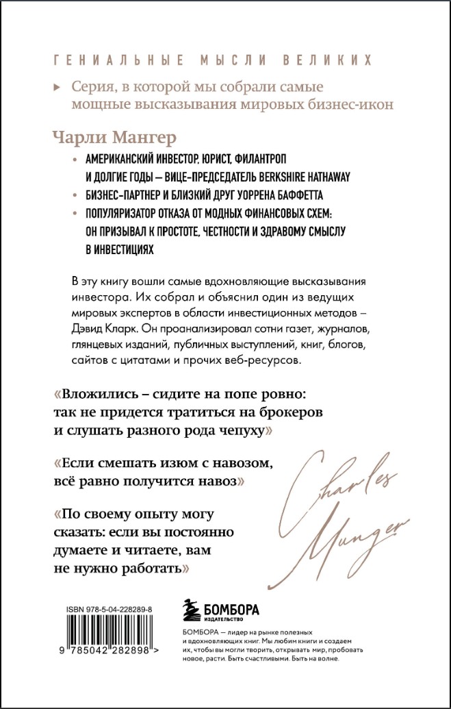 В эту книгу вошли самые вдохновляющие высказывания инвестора. Их собрал и объяснил один из ведущих мировых экспертов в области инвестиционных методов, Дэвид Кларк. Он проанализировал сотни газет, журналов, глянцевых изданий, публичных выступлений, книг, блогов, сайтов с цитатами и прочих веб-ресурсов.