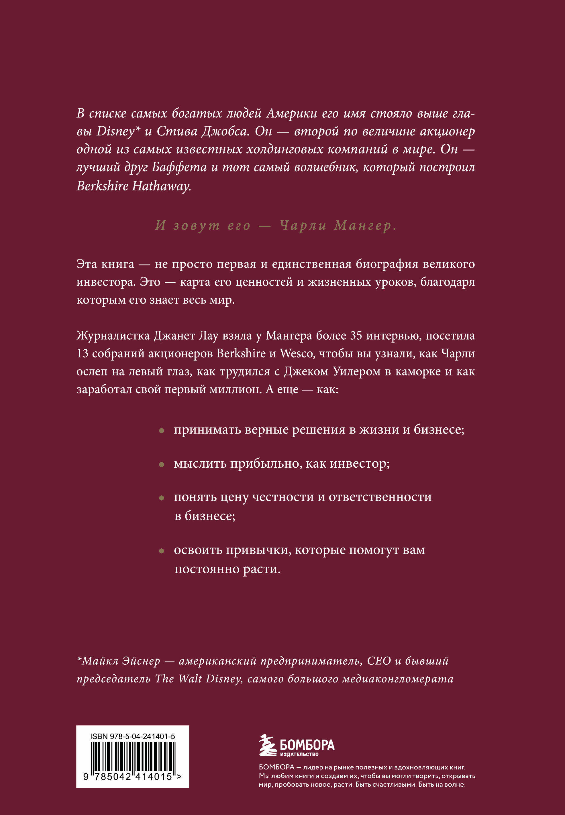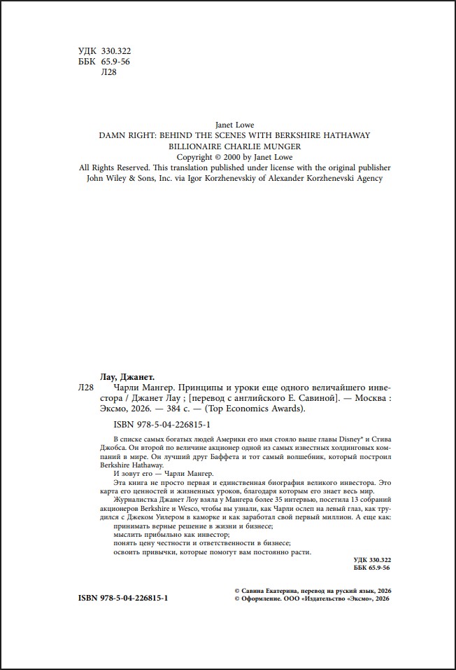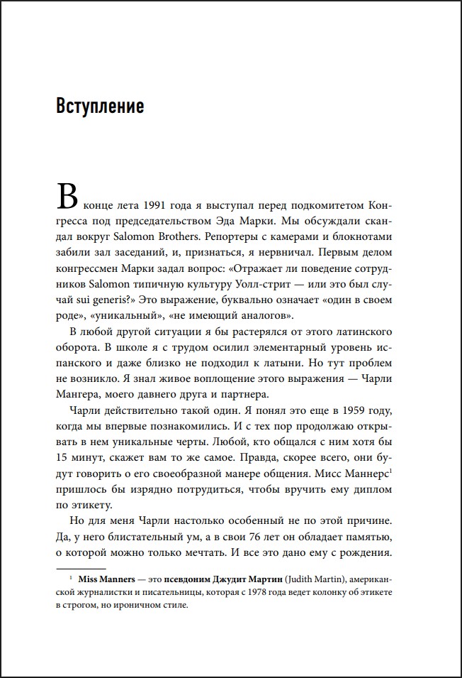 Журналистка Джанет Лоу взяла у Мангера более 35 интервью, посетила 13 собраний акционеров Berkshire и Wesco, чтобы вы узнали, как Чарли ослеп на левый глаз, как трудился с Джеком Уилером в каморке и как заработал свой первый миллион.
