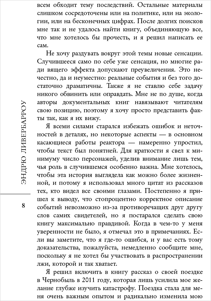 Эндрю Ливербарроу по кусочкам восстанавливает печально известные события 26 апреля 1986 года, прославившие Чернобыль на весь мир. Автор делится своими впечатлениями о Припяти и выводами, к которым он пришел в ходе собственного расследования. Материалы, собранные автором, использовались создателями культового сериала Чернобыль, что позволило им добиться особой достоверности.