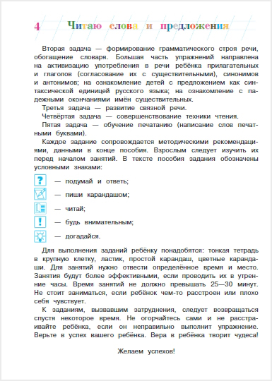 Пособие подготовлено для детей, которые уже знают буквы. Основные задачи издания: совершенствование навыков и техники чтения; закрепление знаний о гласных и согласных звуках и буквах; знакомство со слогом как частью слова и с предложением как синтаксической единицей русского языка; закрепление навыков письма печатными буквами.
