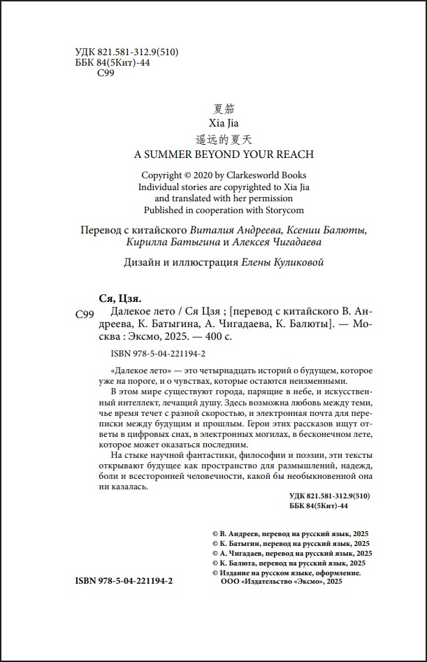 «Далекое лето» – уникальный сборник научно-фантастических рассказов из Китая, напоминающий по тону лучшие произведения Рэя Брэдбери. Ся Цзя соединяет в своих рассказах технологическое будущее с фольклорными корнями, мифами и ностальгией по исчезающему прошлому.
