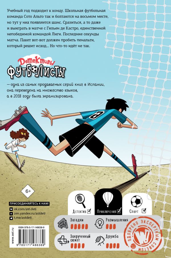 Оставить отзывУчебный год подходит к концу. Школьная футбольная команда Сото Альто так и болтаются на восьмом месте, но тут у них появляется шанс. Сразиться, а то даже и выиграть в матче с Гильен де Кастро, единственной непобедимой командой Лиги. Последние секунды матча. Пакет вот-вот должен пробить пенальти, который решит исход... Но что-то идёт не так. Роберто Сантьяго работал сценаристом на телевидении, редактором и продюсером. Серия про детективов-футболистов стала настоящим культурным феноменом, это одни из самых продаваемых книг в Испании, они переведены на разные языки мира, а в 2018 году даже были экранизированы.