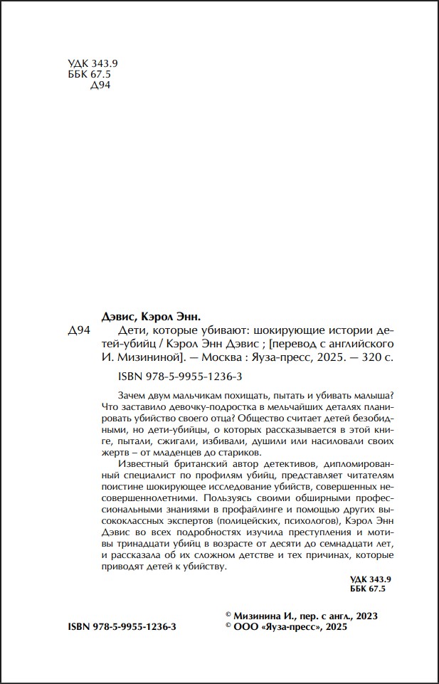 Известный британский автор детективов, дипломированный специалист по профилям убийц, представляет читателям поистине шокирующие исследование убийств, совершенных несовершеннолетними.