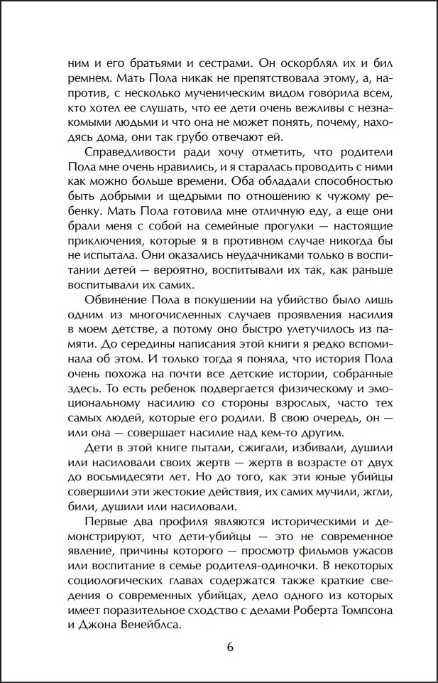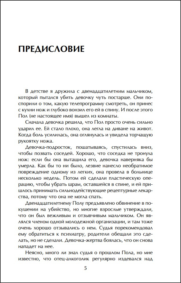 Оставить отзыв«В детстве я дружила с двенадцатилетним мальчиком, который пытался убить девочку чуть постарше его. Они поспорили о том, какую телепрограмму смотреть, и он принес с кухни нож и глубоко вонзил его ей в спину…»