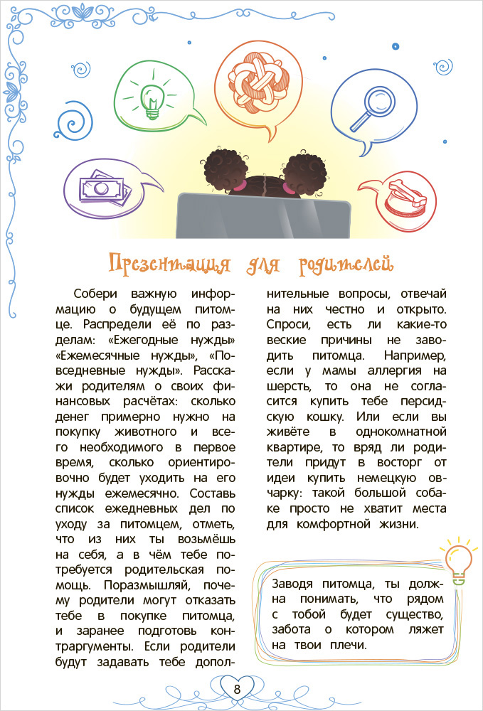 Вместе с героями книги весёлыми любознательными девчонками Софией и Машей девочки-подростки узнают, что такое семейный бюджет; как подготовиться к появлению питомца в доме и как поговорить об этом с родителями, а также научатся избегать ситуаций, которые могут быть опасны.