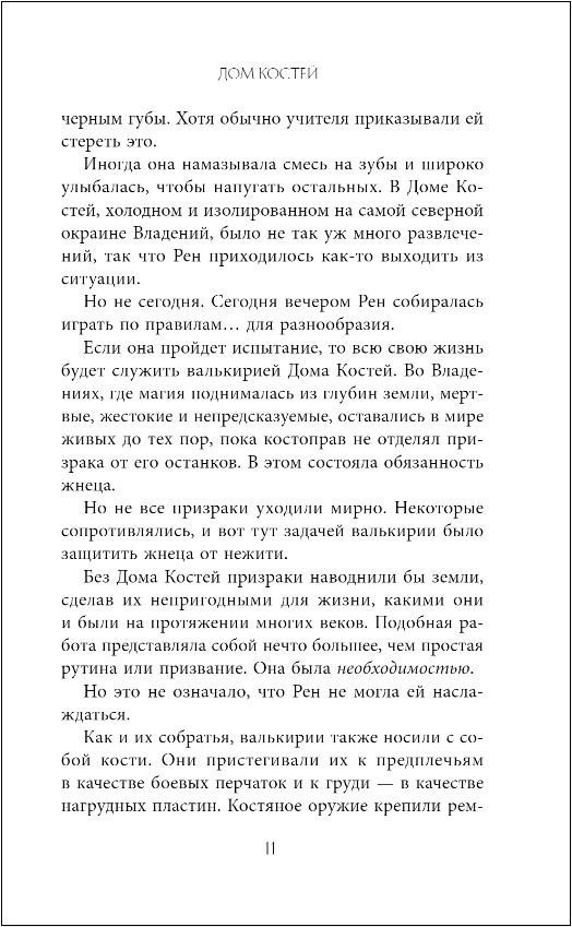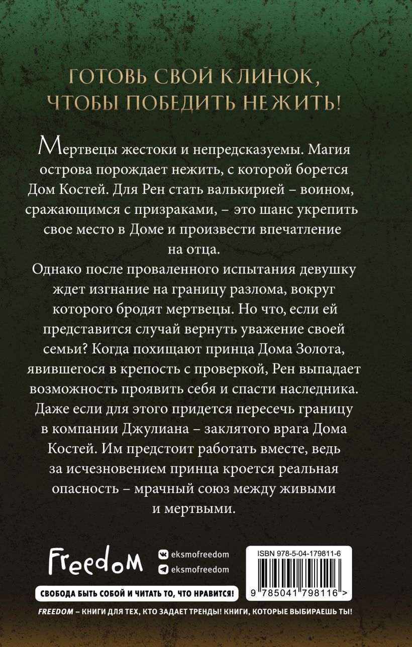 Мертвецы жестоки и непредсказуемы. Магия острова порождает нежить, с которой борется Дом Костей. Для Рен стать валькирией – воином, сражающимся с призраками – это шанс укрепить свое место в доме и произвести впечатление на отца. Однако, после проваленного испытания, девушку ждет изгнание на границу разлома, вокруг которого бродят мертвецы. Но что, если ей представится случай вернуть уважение своей семьи? Когда похищают принца Дома Золота, явившегося в крепость с проверкой, Рен выпадает возможность проявить себя и спасти наследника. Даже если для этого придется пересечь границу в компании Джулиана – заклятого врага Дома Костей. Им предстоит работать вместе, ведь за исчезновением принца кроется реальная опасность – мрачный союз между живыми и мертвыми.